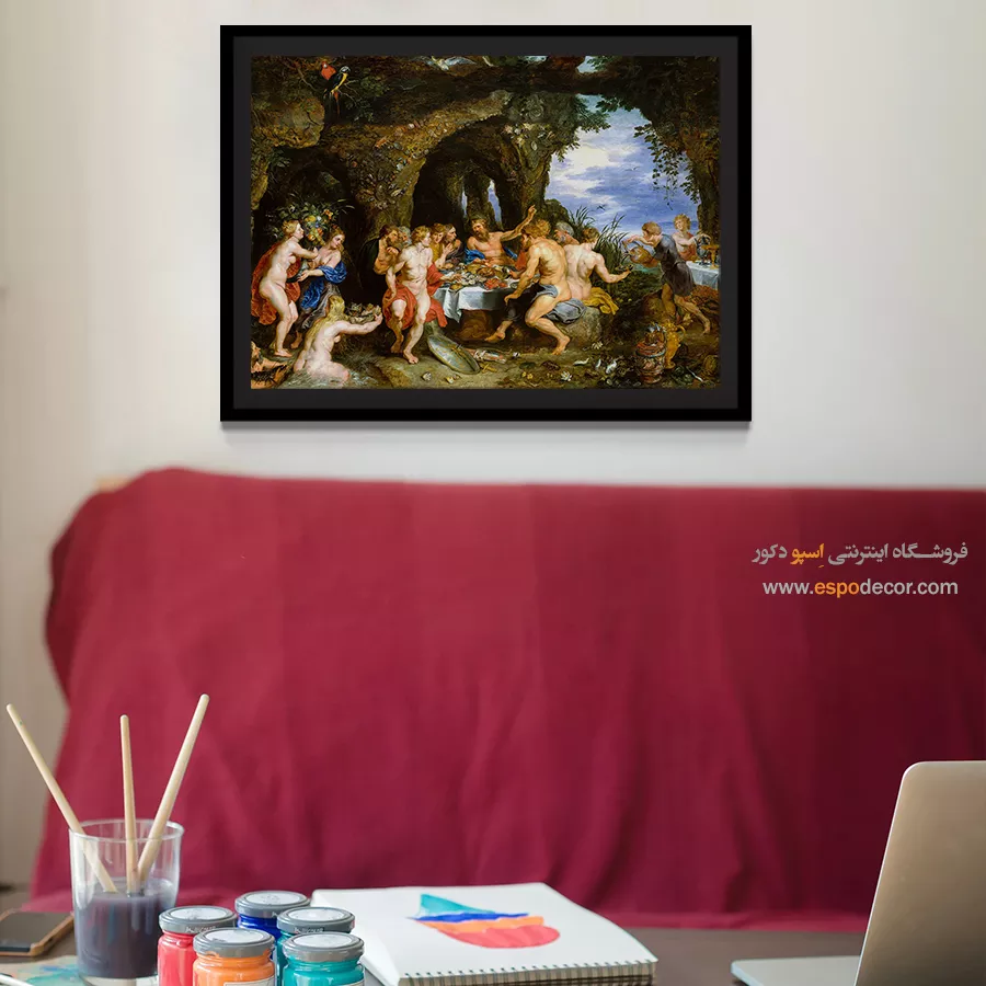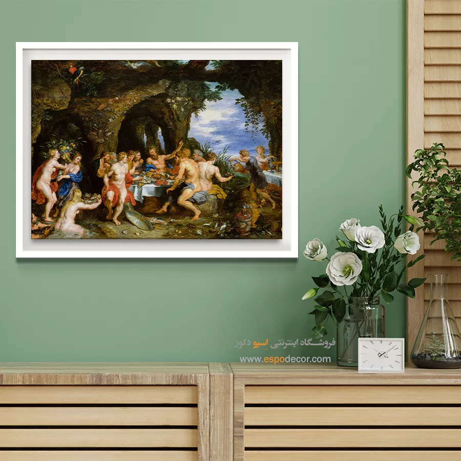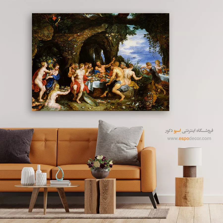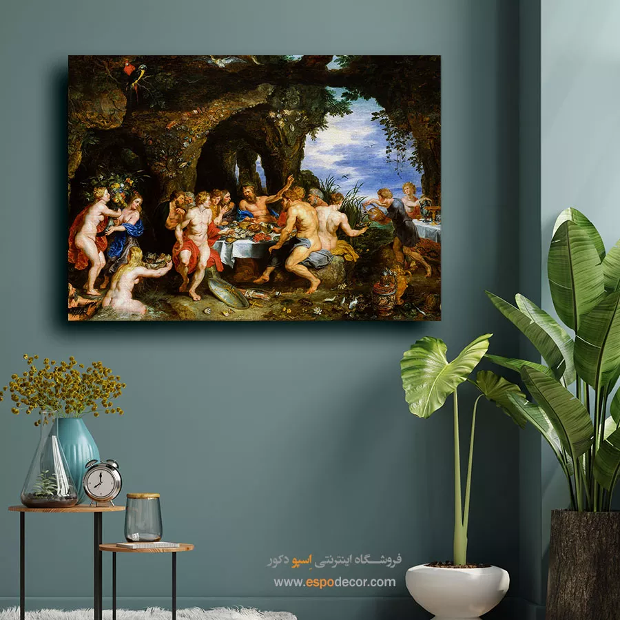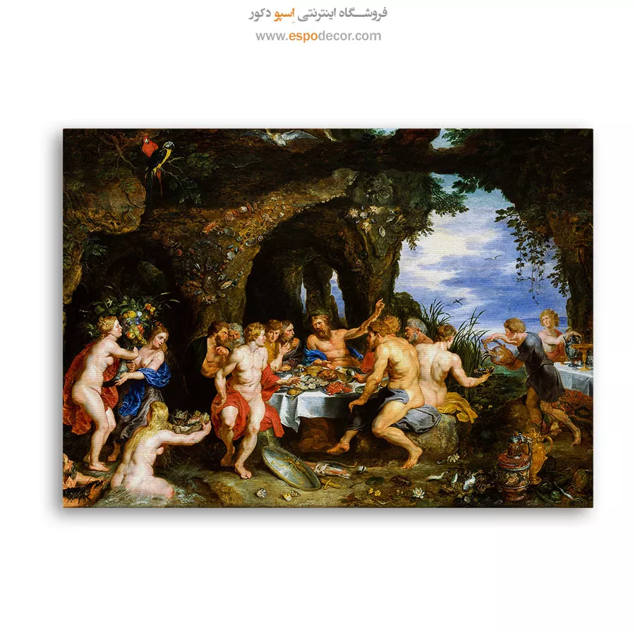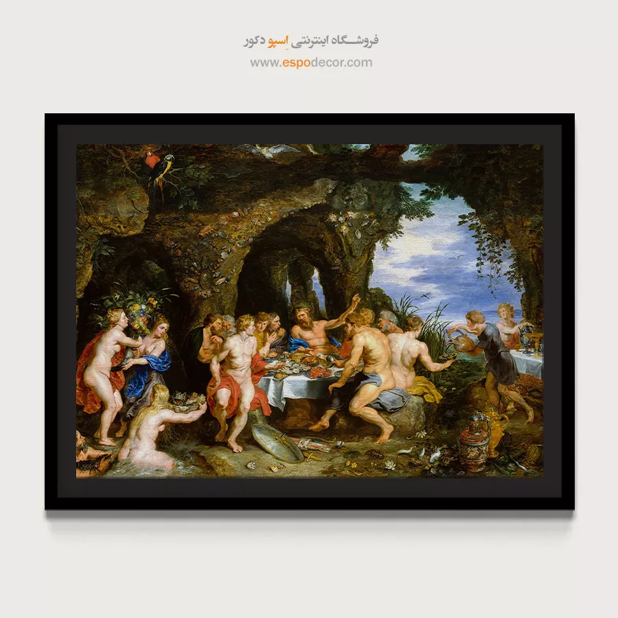 این نقاشی مهمانی اسطورهای خدایان را در غاری پر از جزئیات رنگی و نورانی به تصویر میکشد. ترکیب پرشور و رنگهای زنده، حسی از جشن و زندگی را منتقل میکند.
