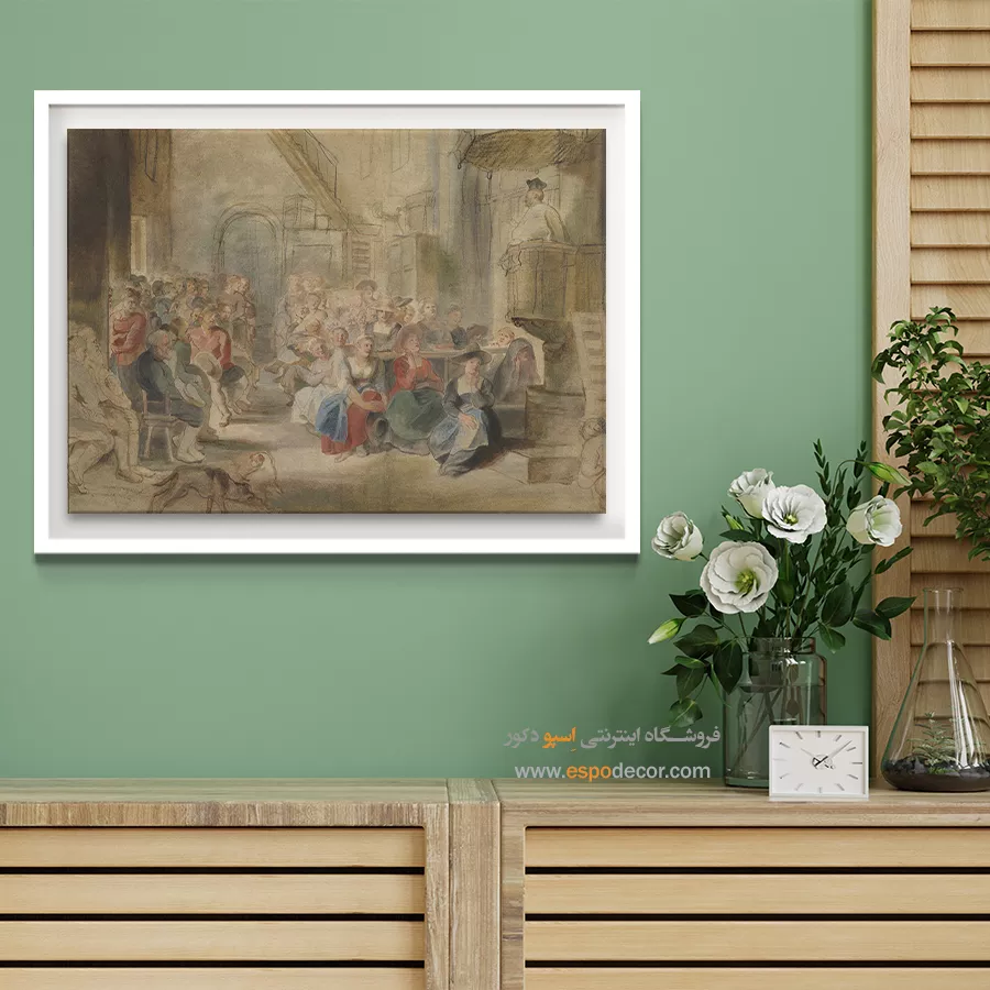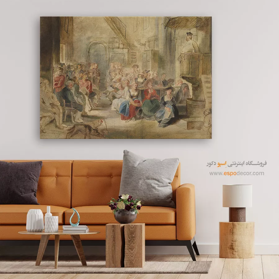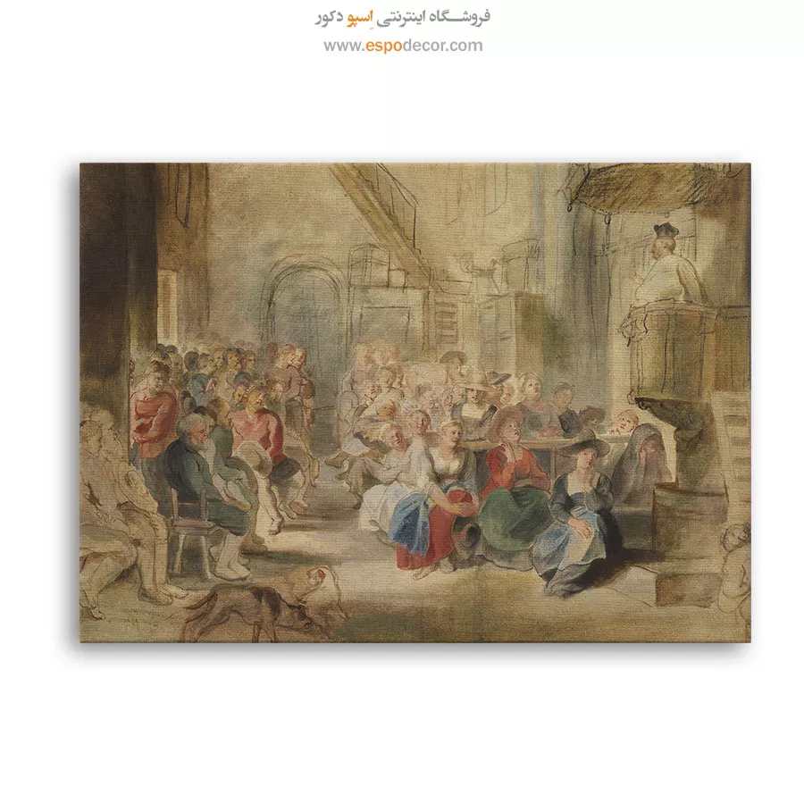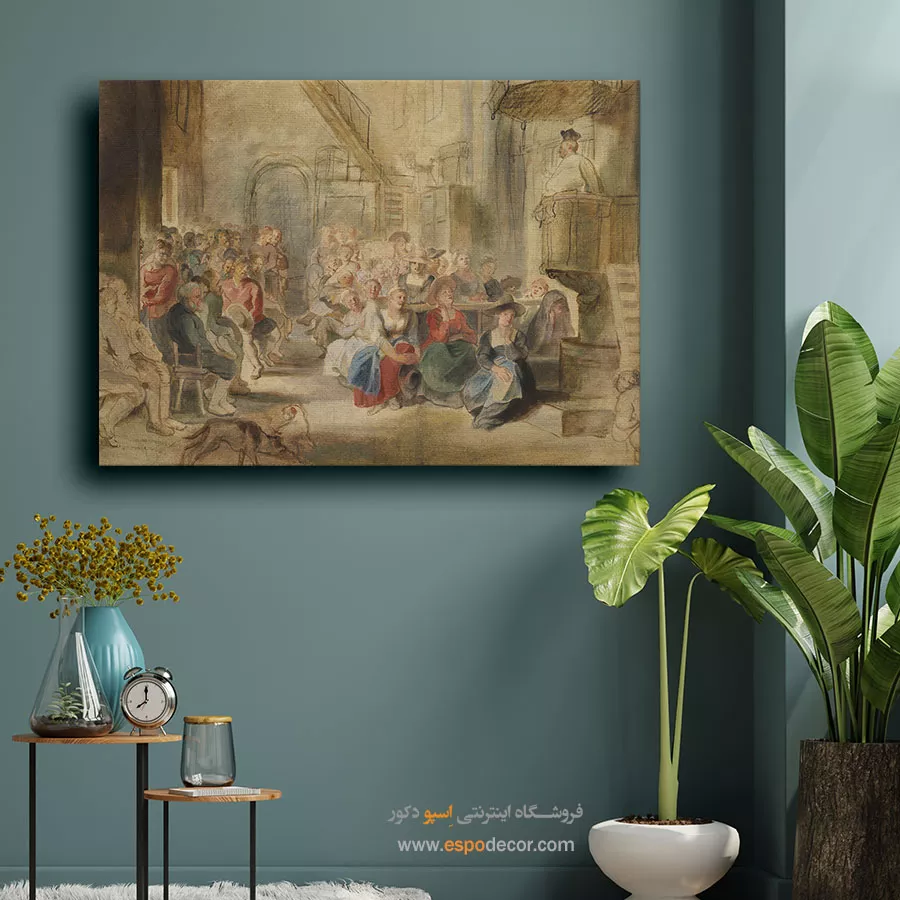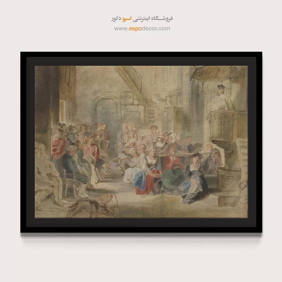تابلوی «موعظه در کلیسا» از روبنس، نمایی پرشور از اجتماع مردم را نشان میدهد که با اشتیاق به خطبه مذهبی گوش میسپارند. رنگهای بژ و آبی، صحنهای گرم و انسانی خلق کردهاند و تنوع چهرهها، واقعگرایی اثر را تقویت کرده است. این تابلو نماد ایمان جمعی و همبستگی انسانها در بستر معنویت است.