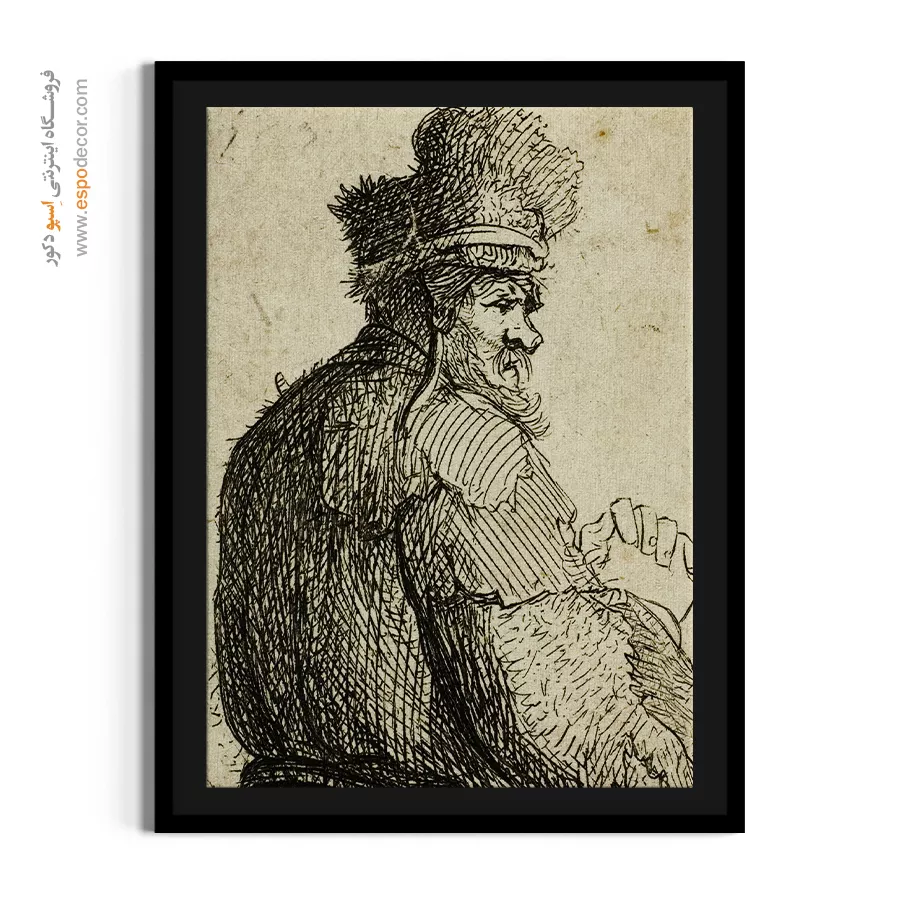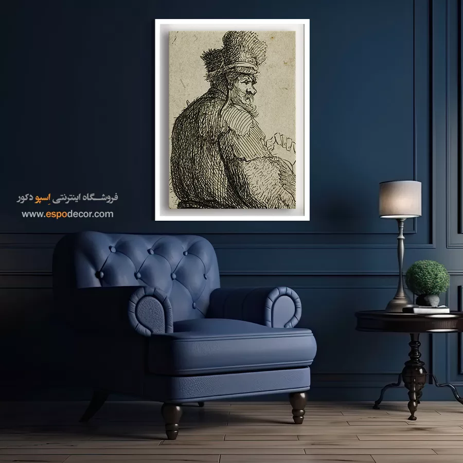 این مطالعه فیگور، با تمرکز بر پشت و لباسهای غنی یک پیرمرد، حس رمز و راز و عمق بصری را القا میکند. رامبراند با نمایش بافت لباس، بر اهمیت فرم و سایه تأکید دارد. این تابلو، انتخابی متفاوت و متفکرانه برای گالریهای هنری و فضاهای مینیمال است.