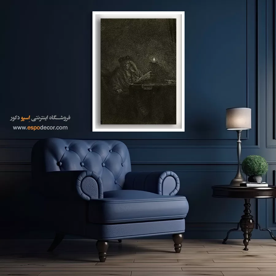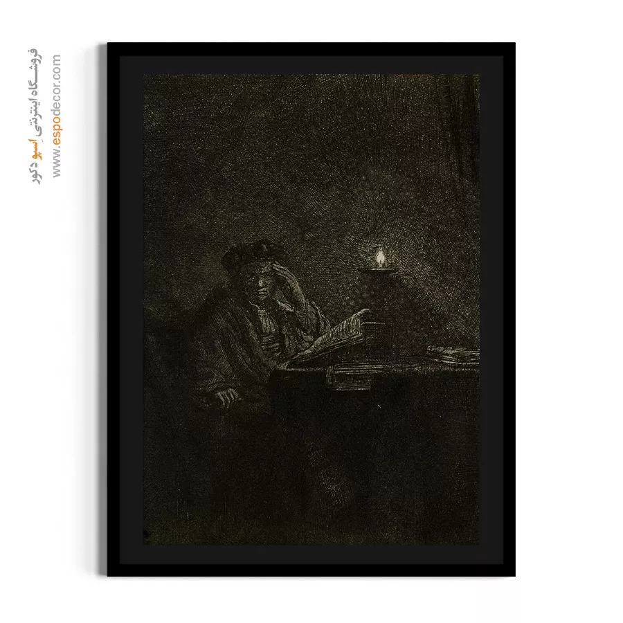 خرید تابلو نقاشی دانشجو کنار میز با نور شمع رامبراند \| تمرکز و جستجوی دانش