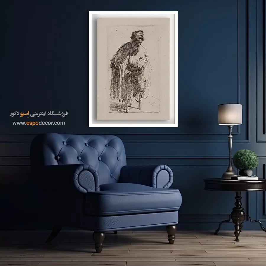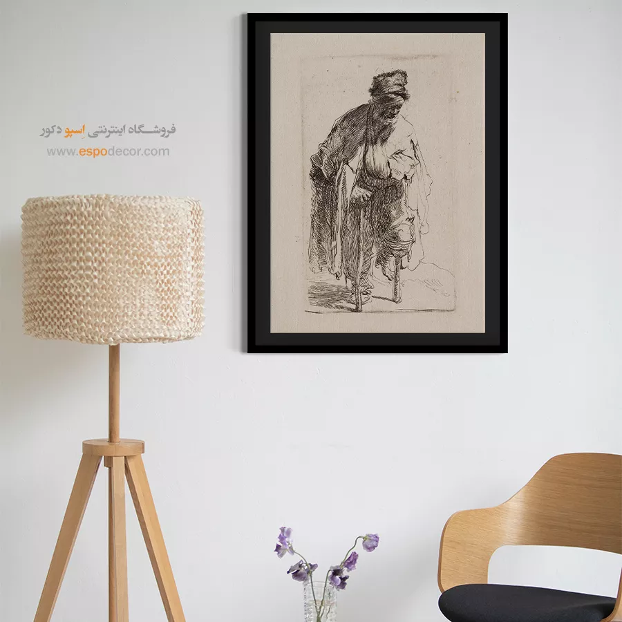 این پرتره واقعگرایانه، با تمرکز بر گدایی با پای چوبی، نمادی از رنج، استقامت و واقعگرایی بیپرده هلندی است. رامبراند با جزئیات دقیق، بر کرامت و قدرت شخصیت تأکید دارد. این اثر، انتخابی قدرتمند و تأثیرگذار برای دکوراسیون است.
