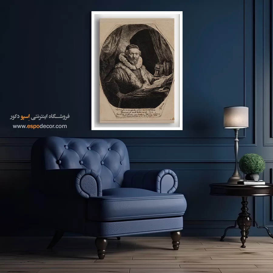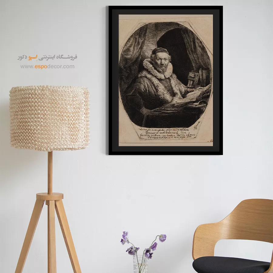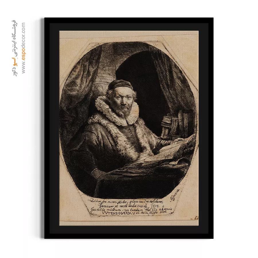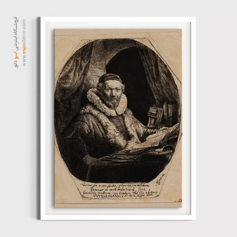 پرتره رسمی جان اویتنبوگارت، الهیدان مشهور، با تمرکز بر حالت متفکرانه و لباسهای رسمی. نورپردازی بر چهره و عمق شخصیت او تأکید دارد. چاپ گالری این اثر، انتخابی آکادمیک و باوقار است.