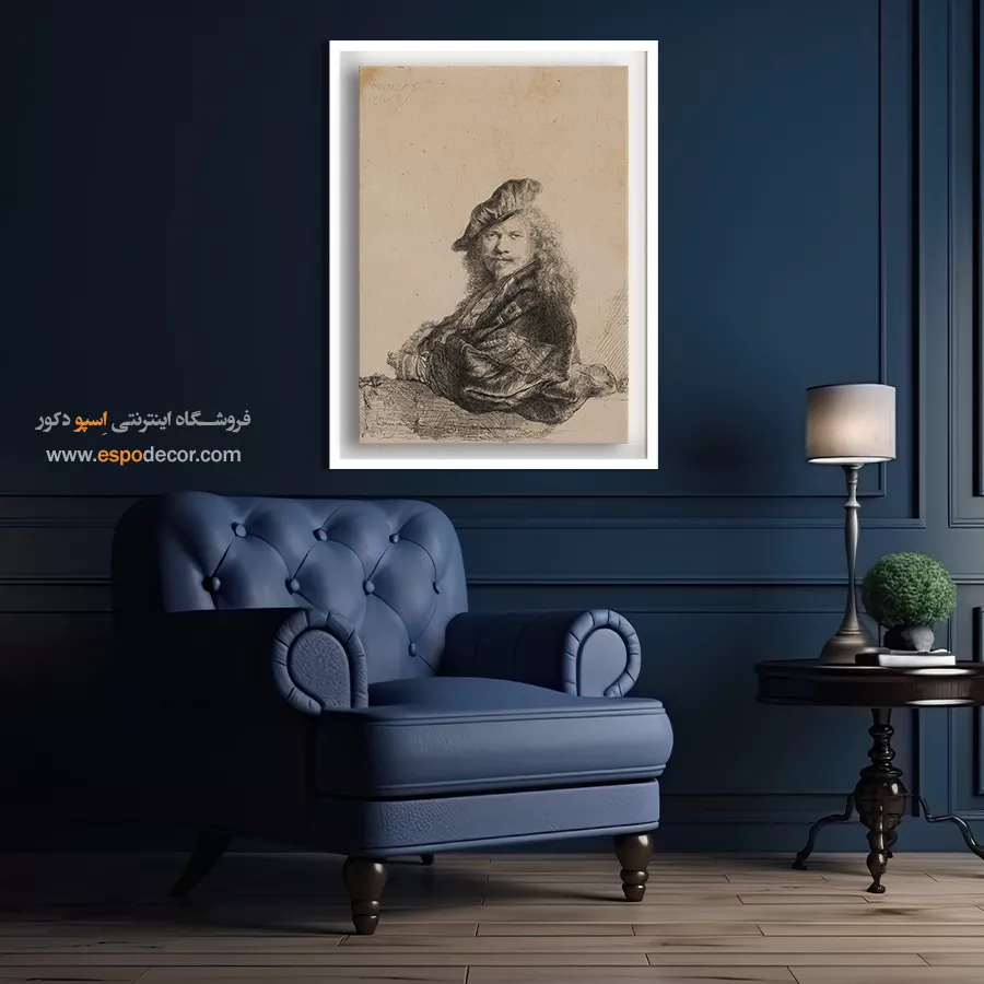 این سلف پرتره، رامبراند را در حالتی متفکرانه و با اعتمادبهنفس، تکیه زده بر طاقچهای سنگی نشان میدهد که یک ژست کلاسیک برگرفته از استادان رنسانس است. پالت رنگی تیره و عمیق، فضایی باوقار خلق کرده است. رامبراند از نورپردازی دراماتیک (کیاروسکورو) استفاده کرده تا نور را به شدت بر چهره و دستهای او جلب کند. این تابلو نمادی از **اوج مهارت هنری، خودآگاهی و احترام به سنتهای کلاسیک** است و یک عنصر قدرتمند برای دکوراسیون است.