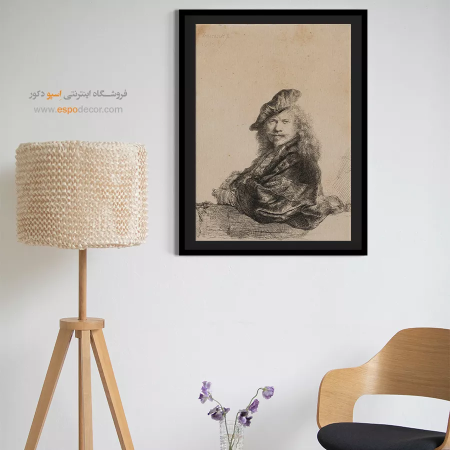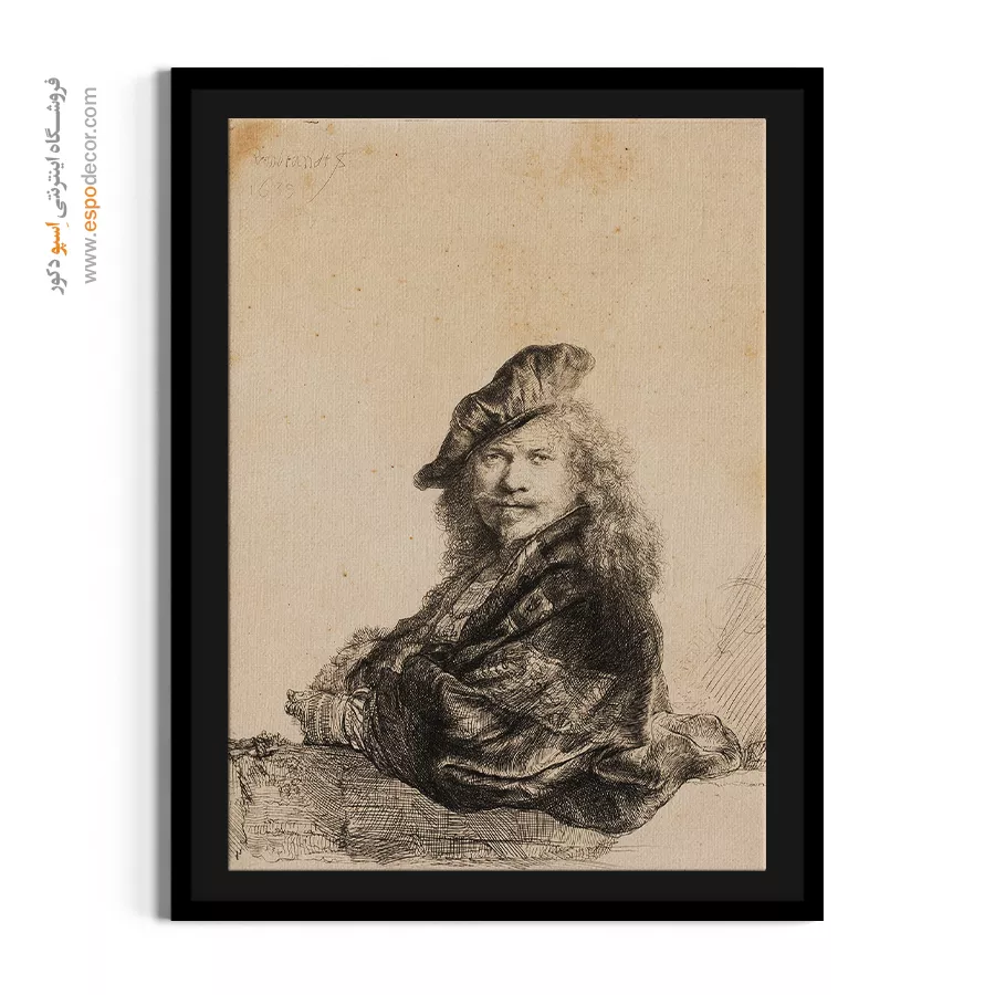 خرید تابلو سلف پرتره تکیه بر طاقچه سنگی رامبراند \| شاهکار اعتمادبهنفس و نورپردازی