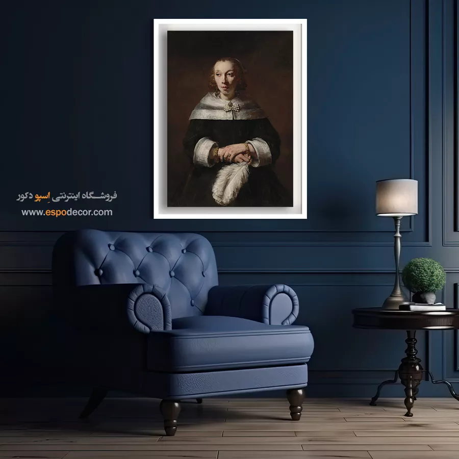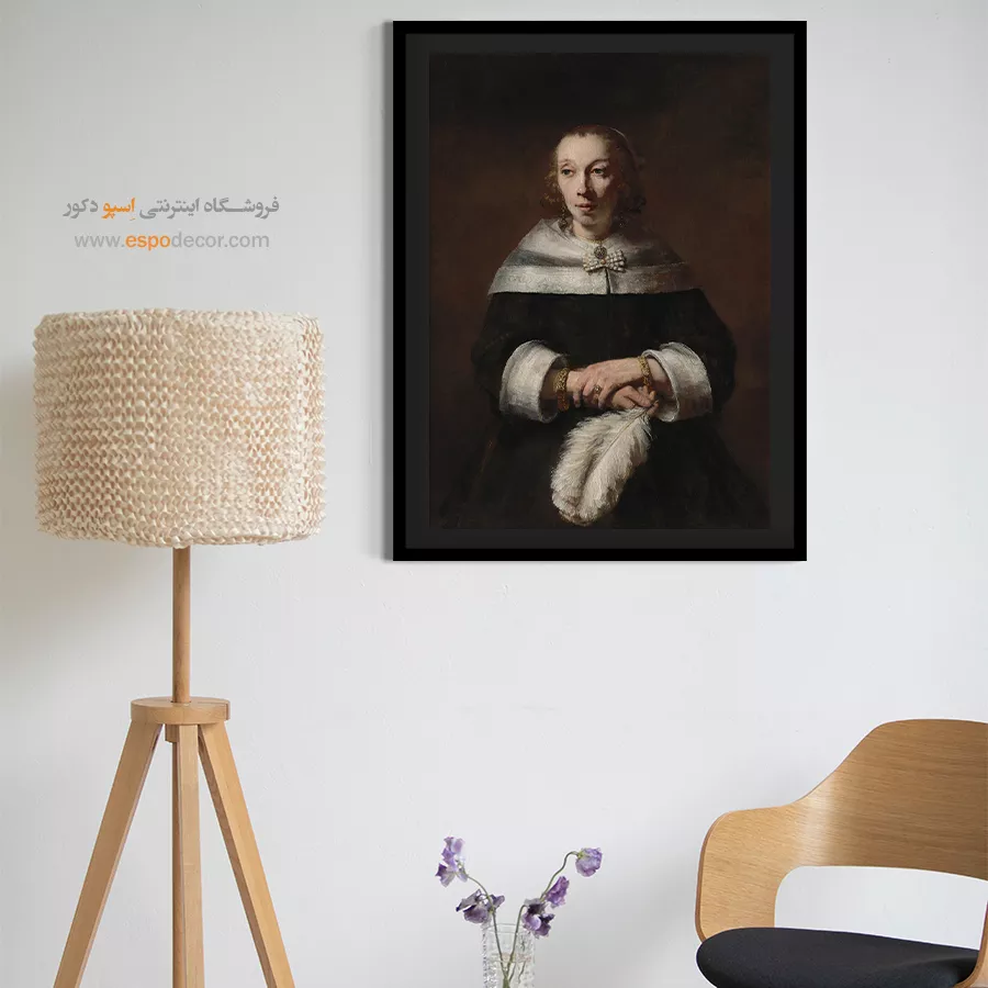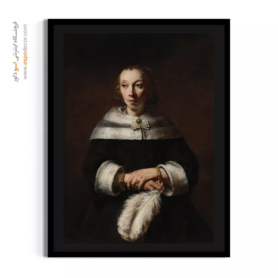 خرید تابلو پرتره بانویی با بادبزن پر شترمرغ رامبراند \| شکوه، ثروت و جایگاه اجتماعی