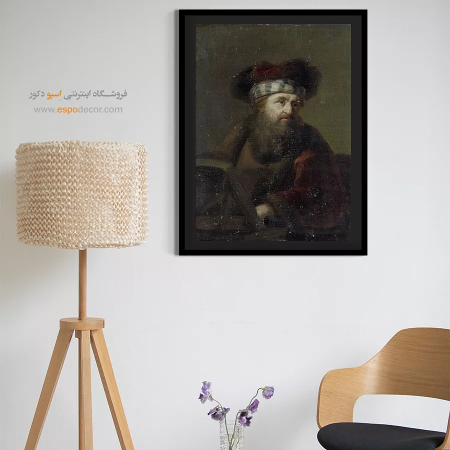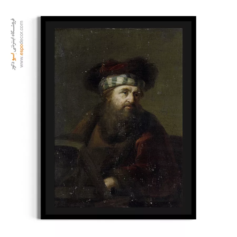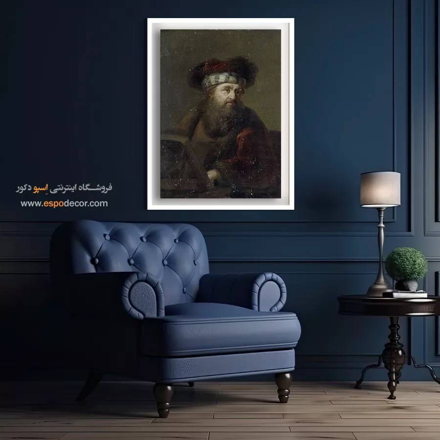 این پرتره متفکرانه، با تمرکز بر چهره یک خاخام (Rabbi) سالخورده، نمادی از حکمت و عمق معنوی است. پالت رنگی گرم و تیره، فضایی آرام و روحانی خلق کرده است. رامبراند بر جزئیات ریش بلند، چین و چروکهای چهره و نگاه نافذ او متمرکز است. نورپردازی ملایم و موضعی، حس وقار و آرامش درونی سوژه را تقویت میکند. این تابلو یک عنصر متفکرانه و آرامشبخش برای دکوراسیون است.