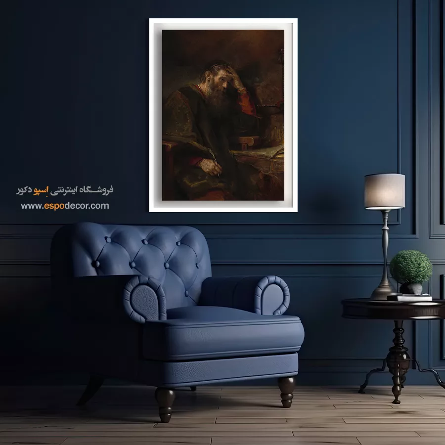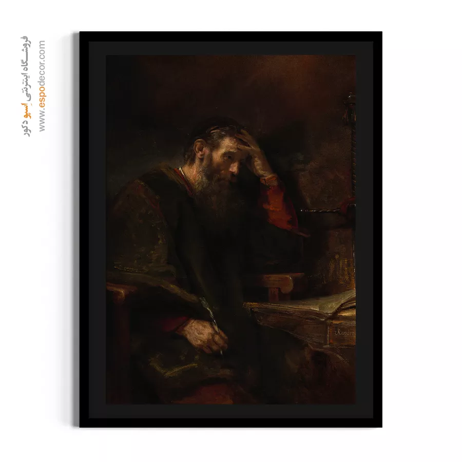 این اثر، تصویری عمیق و متفکرانه از پولس رسول (سنت پل) را به تصویر میکشد. پالت رنگی تیره و عمیق، فضایی روحانی و آرام خلق کرده است. رامبراند بر چهره رنجور، حالات غرق در تفکر و کتاب یا شمشیری در دستان او متمرکز است که نماد ایمان و کلام او است. نورپردازی ملایم و موضعی، بر عمق معنوی و آرامش درونی سوژه تأکید دارد. این تابلو یک عنصر متفکرانه و آرامشبخش برای دکوراسیون است.