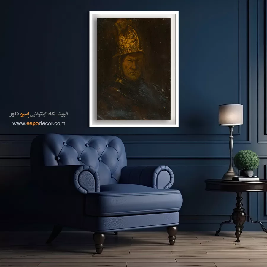 این شاهکار پرتره بر روی بوم کنواس (Canvas) با کیفیت گالری چاپ میشود. چاپ با استفاده از رنگهای با کیفیت و مقاوم، تضمین میکند که تمامی جزئیات تیره و کنتراست نور بر روی طلا با وضوح بالا بازتولید شوند. این تابلو یک انتخاب ایدهآل برای دفاتر مدیریتی و فضاهای با تم قدرت و تاریخ است. **فروش آثار رامبراند** با تم جنگجو، حسی از قدرت را به فضا میبخشد.