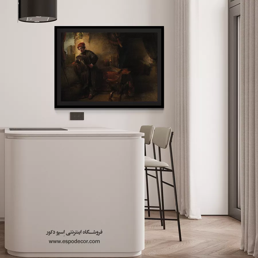 تمرکز بر چهره متفکر و استفاده از نورپردازی موضعی، حالت درونی و عمق روانشناختی سوژه را برجسته میسازد. پالت رنگی گرم و خاموش، فضایی آکادمیک و متمرکز ایجاد کرده است. این تابلو یک انتخاب ایدهآل برای دفاتر کار، کتابخانهها و کسانی است که به دنبال **آثار هنری رامبراند برای فروش** با تم فکری هستند.