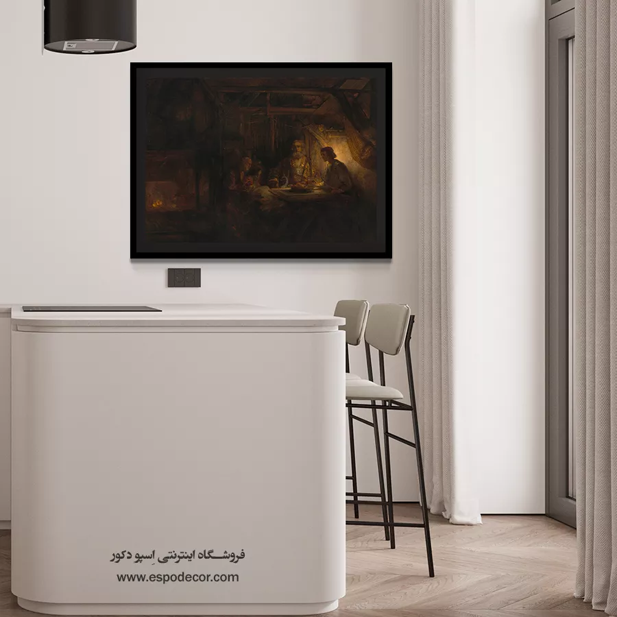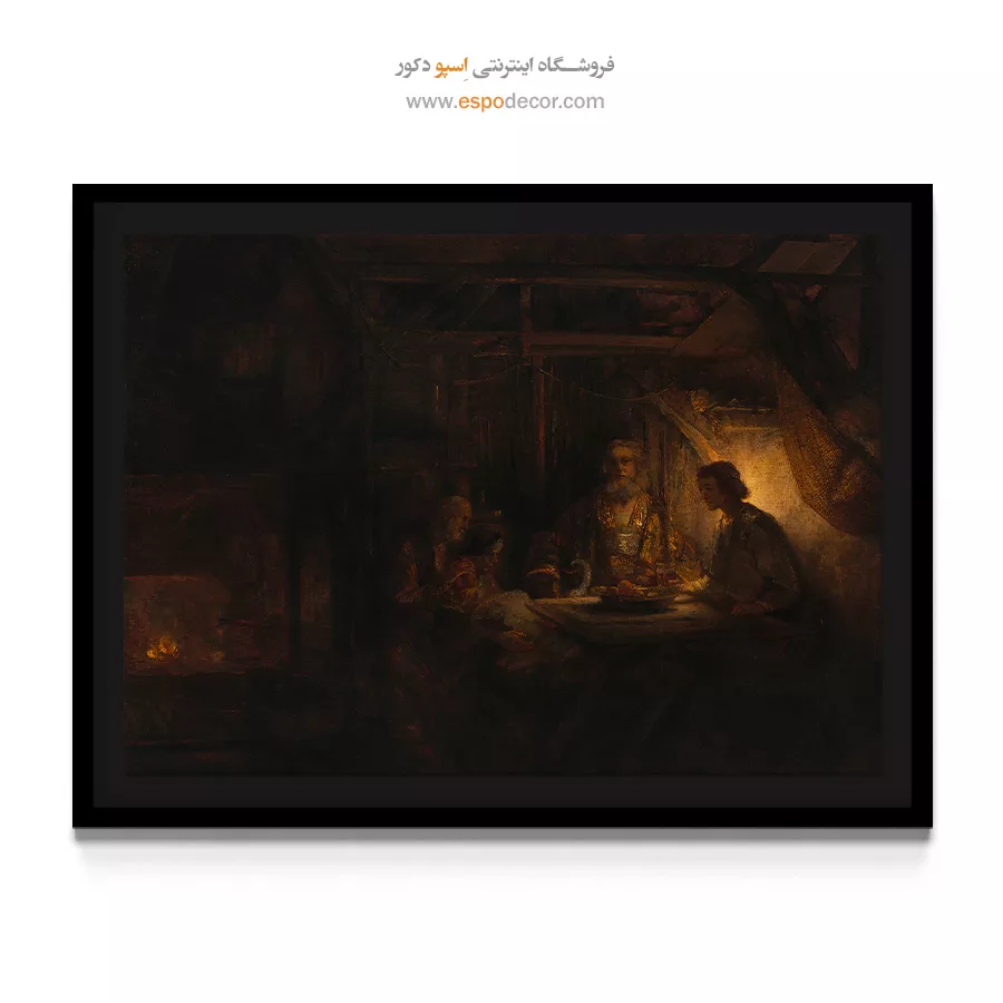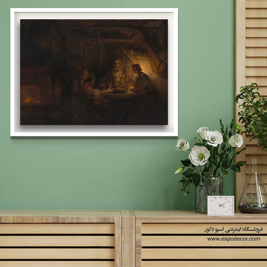 رامبراند صحنه را در یک فضای داخلی تیره، اما با یک منبع نور قوی (شاید آتش یا شعله) به تصویر میکشد که بر چهرههای حیرتزده میزبان و مهمانان (که هویت الهی خود را فاش کردهاند) میتابد. این تابلو یک اثر دراماتیک و روایی در میان **فروش آثار رامبراند** است.