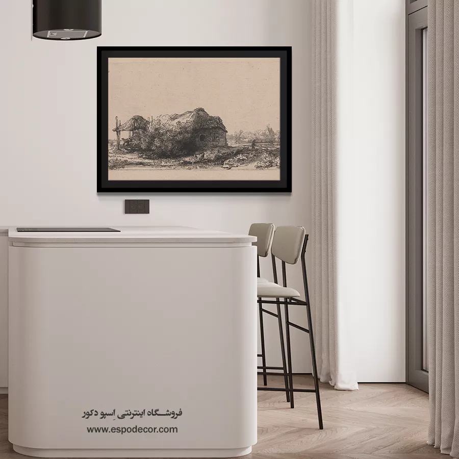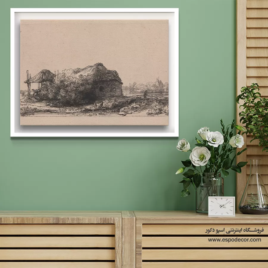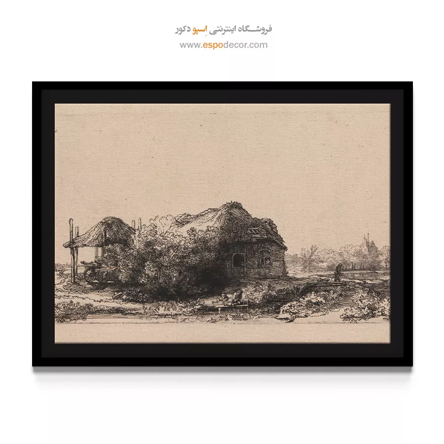 خرید تابلو منظره با کلبه و انبار یونجه رامبراند \| درام طبیعت و حومه هلند