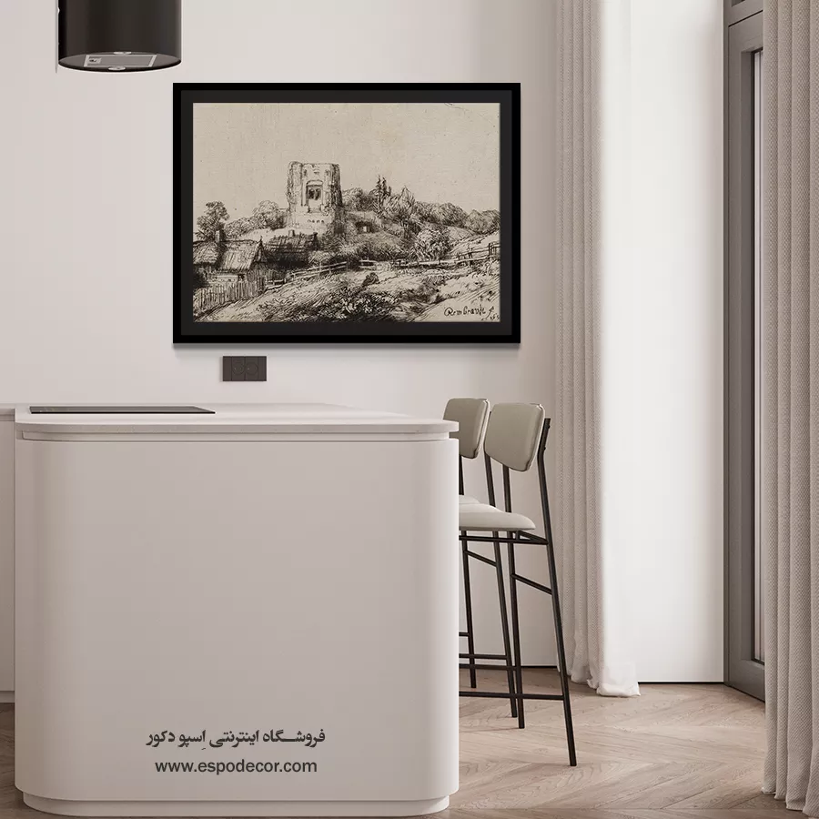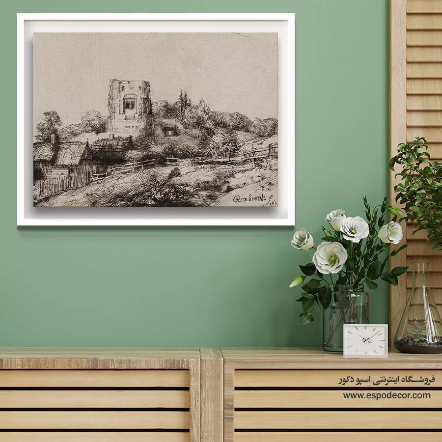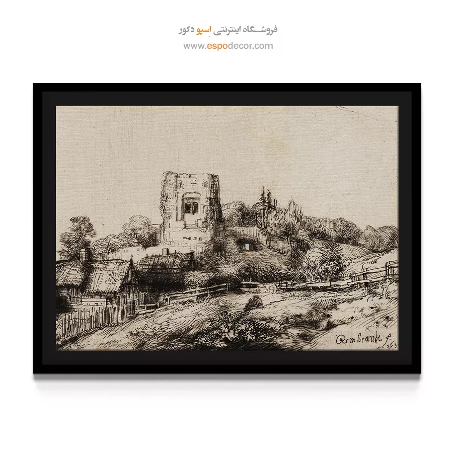 خرید تابلو منظره با برج مربع رامبراند \| معماری هلندی و نورپردازی محیط