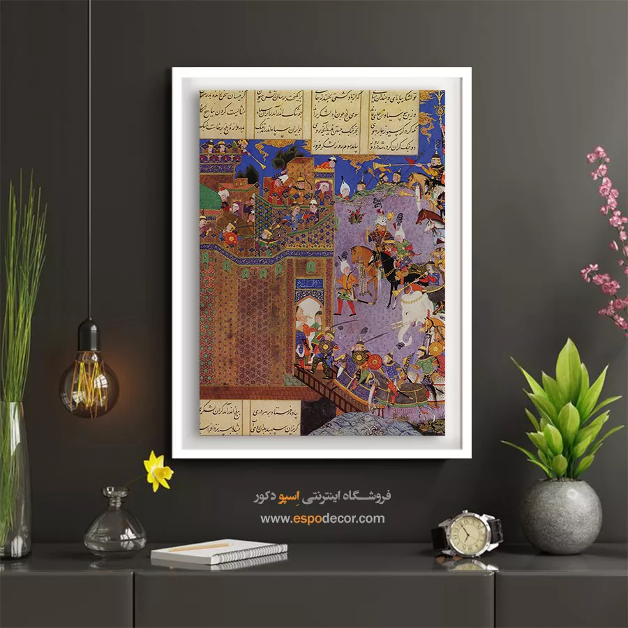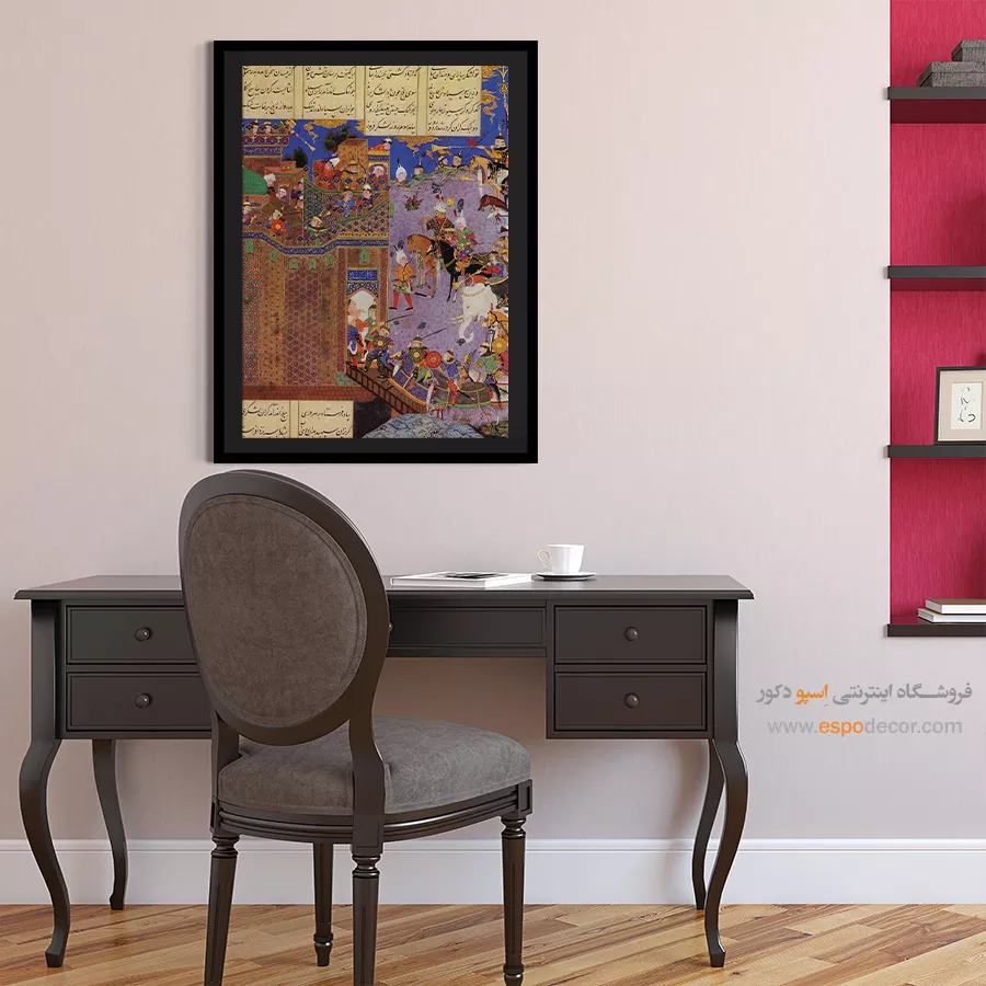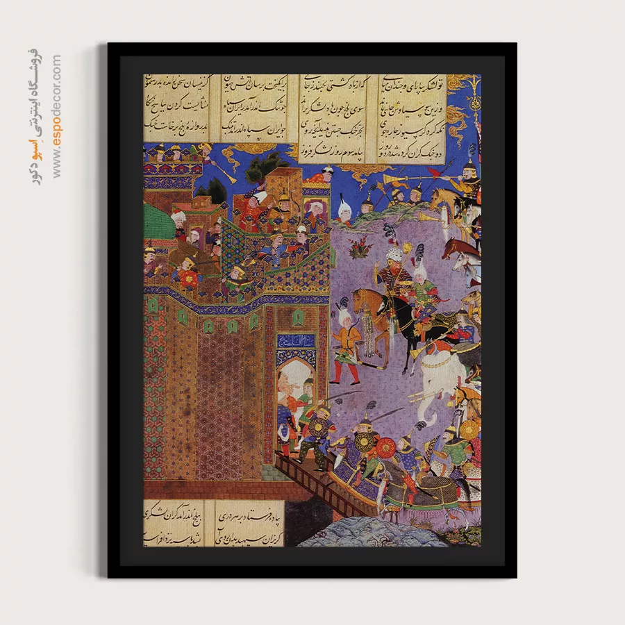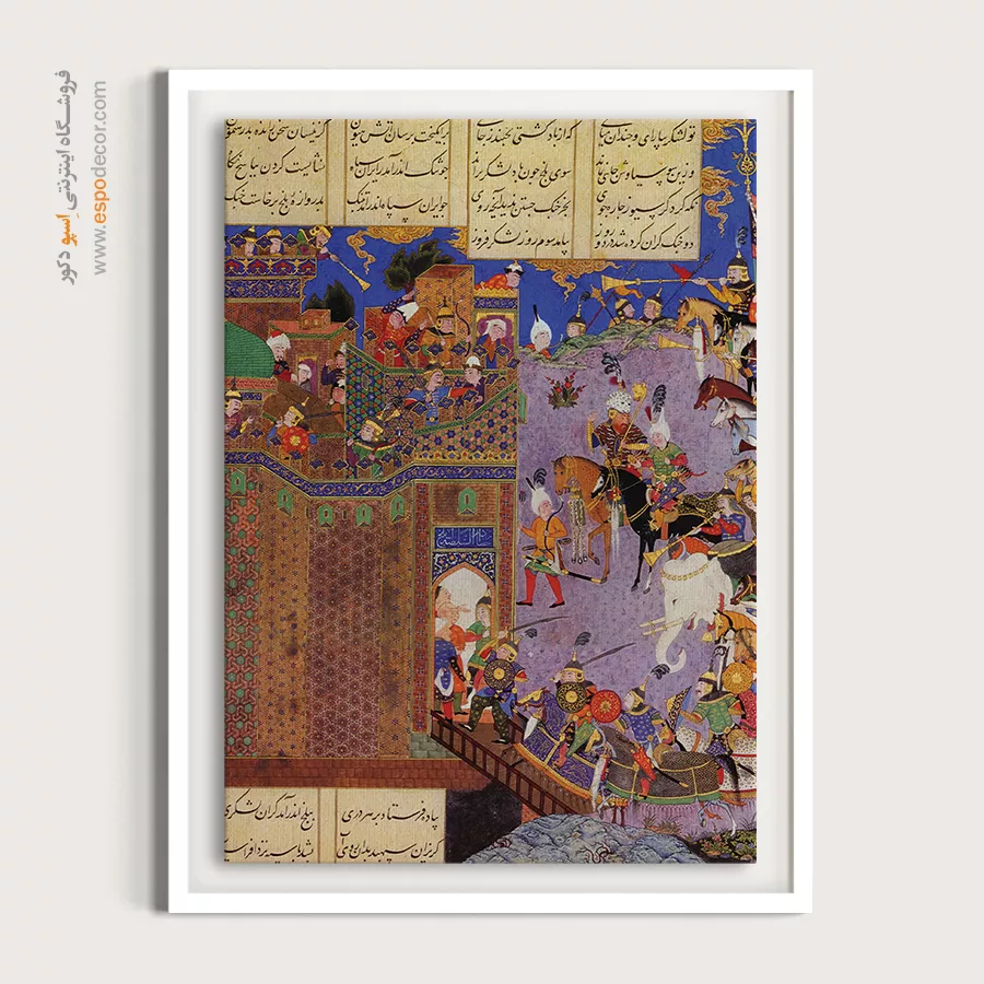 مجلس دیدار در بلخ با تالاری آراسته، نظم درباری و احترام میان رستم و سیاوش را روایت میکند. کاشیها و پردهها با رنگهای درخشان، شأن مجلس را دوچندان کردهاند. مناسب مخاطبانی که تابلو نقاشی کهن ایرانی با موضوع دیدار و آیین میخواهند.