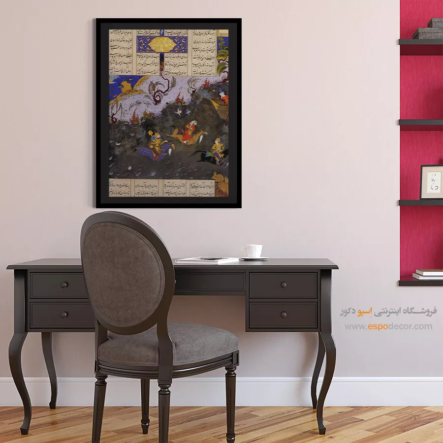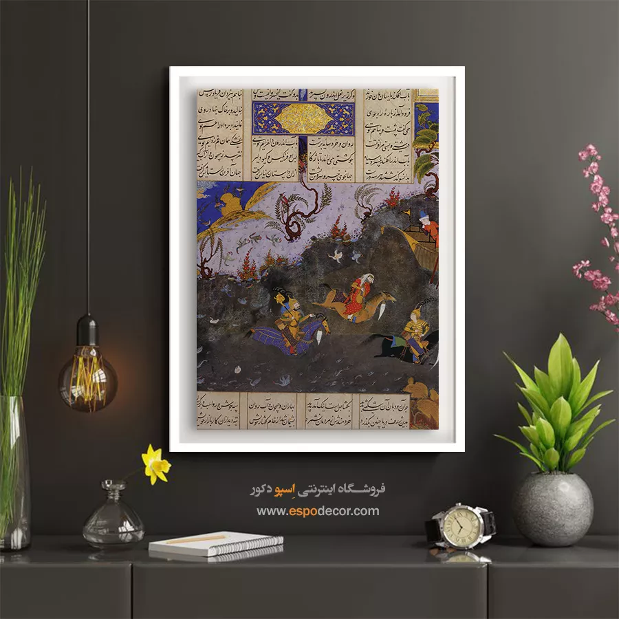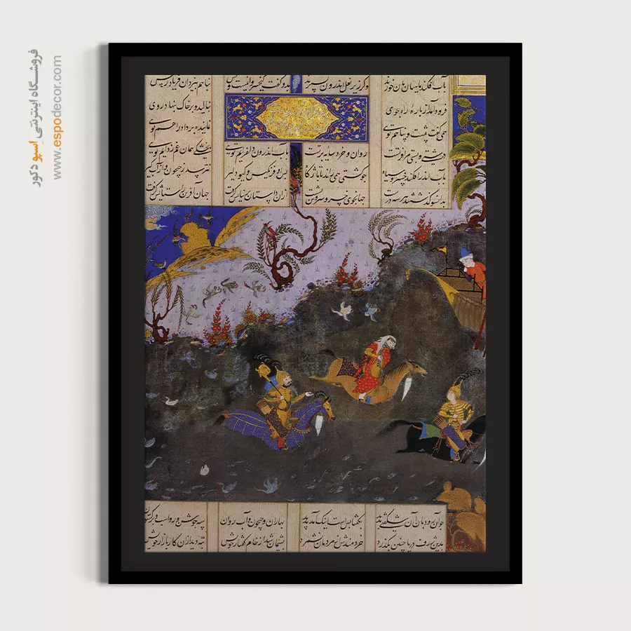این تابلو گذر کیخسرو به همراه فرنگیس و گیو از رود جیحون را به تصویر کشیده است. موجهای خروشان و حرکت پرانرژی اسبها، حسی پرهیجان و ماجراجویانه ایجاد کردهاند. بهترین گزینه برای کسانی است که به دنبال خرید تابلو مینیاتور ایرانی با تم اسطورهای هستند.