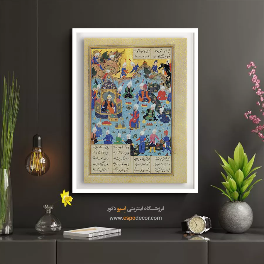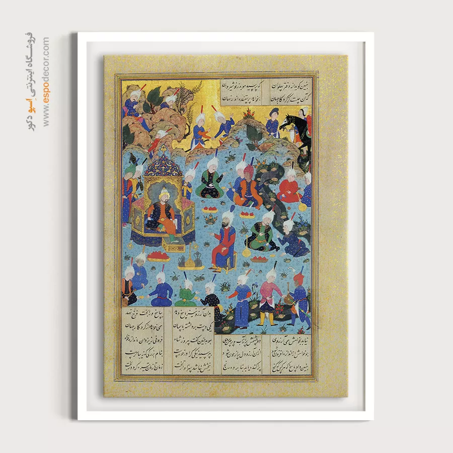 مجلس حضور انوشیروان با حلقهی موبدان و دبیران، پیوند خرد و سیاست را یادآور میشود. بافت لاجوردیِ فرش و آبگونِ زمینه کنار زرینِ تزیینات، فضا را باشکوه و روشن میکند. برای علاقهمندان به تابلو نگارگری داستانهای شاهنامه انتخابی فاخر و روایی است.