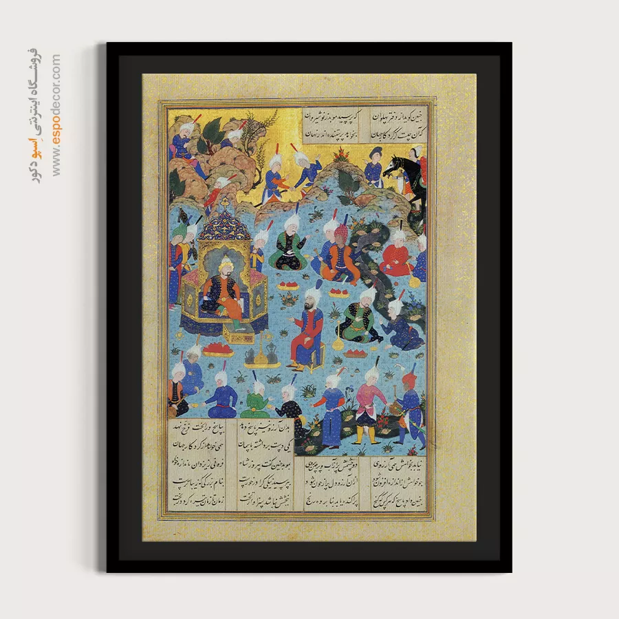 مجلسِ خرد با پادشاه بر تخت و حلقهی موبدان، وقارِ دانش و عدالت را به نمایش میگذارد. چینش نشستها و نقوش ابر، انسجام فکری و نظم بصری را همزمان القا میکند. پیشنهادی ممتاز برای دوستداران تابلو نگارگری داستانهای شاهنامه با محور عقل.