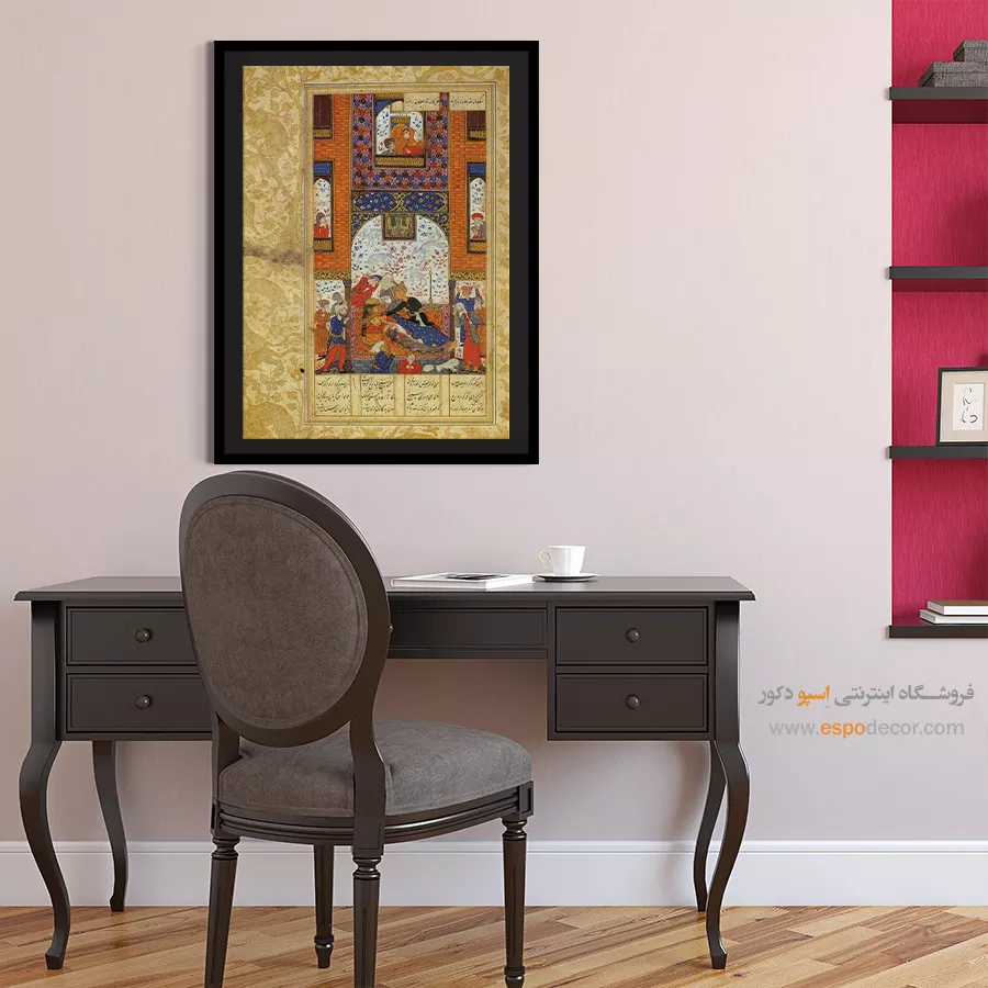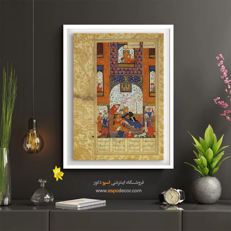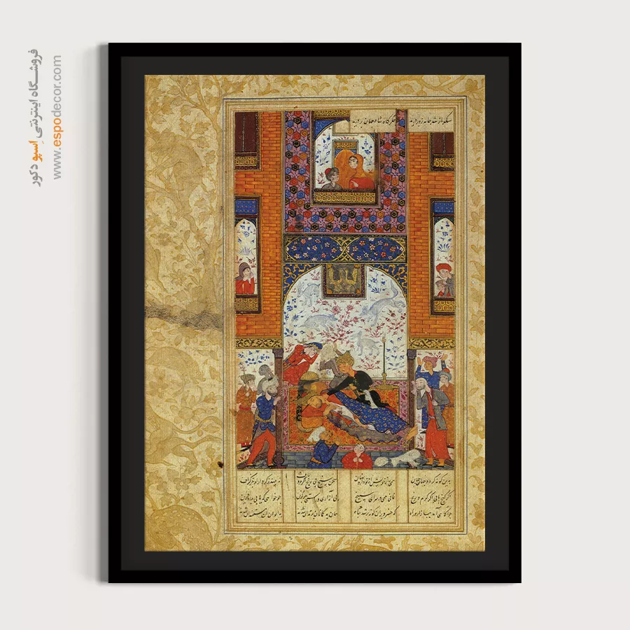 صحنهی داخلی چندپردهای با کاشیکاری و فرشهای پرنقش، اتفاقاتی در میانه تصویر در حال افتادن هست. توازن زرینِ زمینه با لاجورد و قرمز، تابلو را گرم و دیدنی میکند. گزینهای سنجیده برای خرید تابلو مینیاتور شاهنامه با روایت درونفضا.