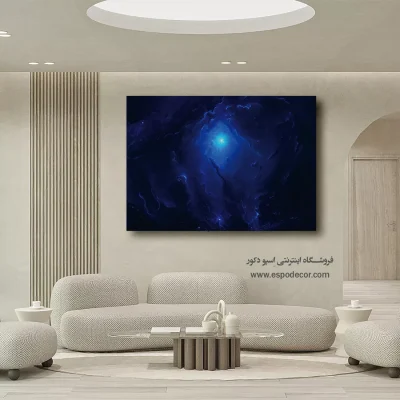• انتخاب سایه‌های مختلف از رنگ دیوار: مانند تابلو آبی تیره روی دیوار آبی روشن، که حس آرامش و یکپارچگی در فضا ایجاد می‌کند.