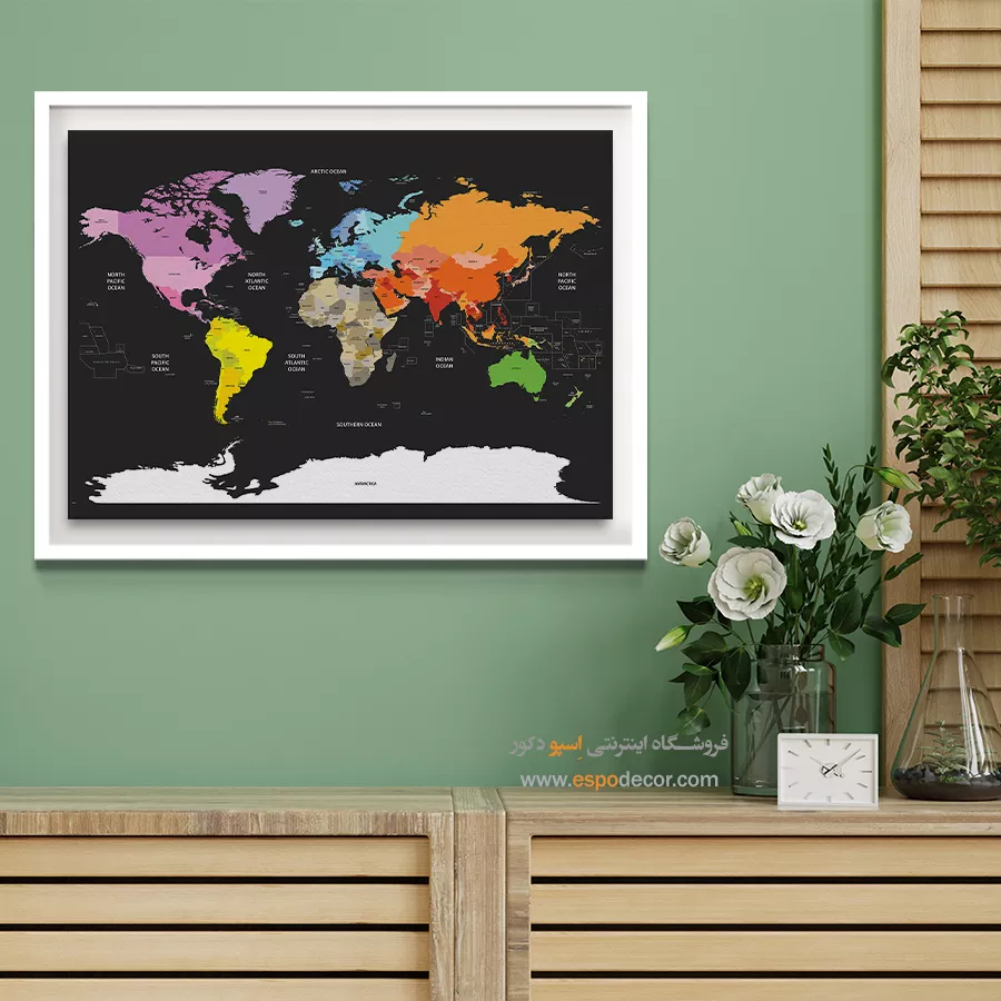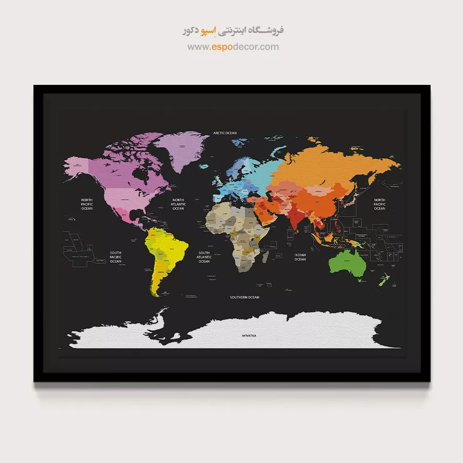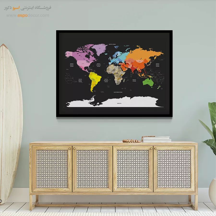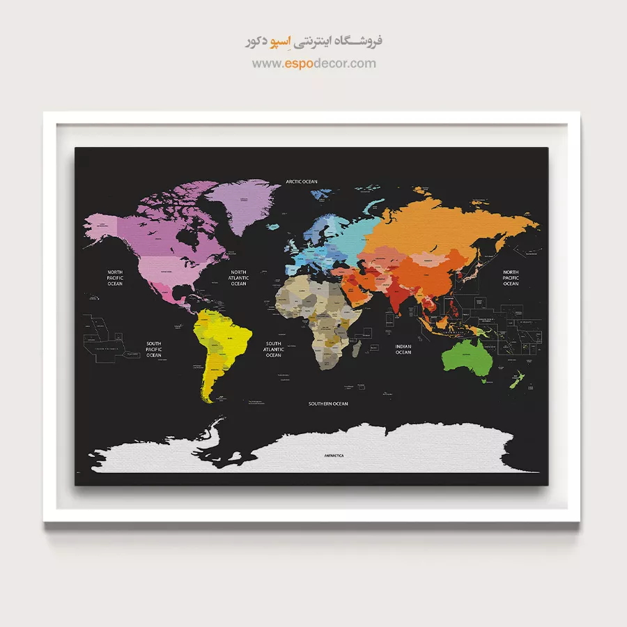 تابلو نقشه جهان مینیمال «خرید تابلو نقشه جهان مینیمال» با قاب مشکی