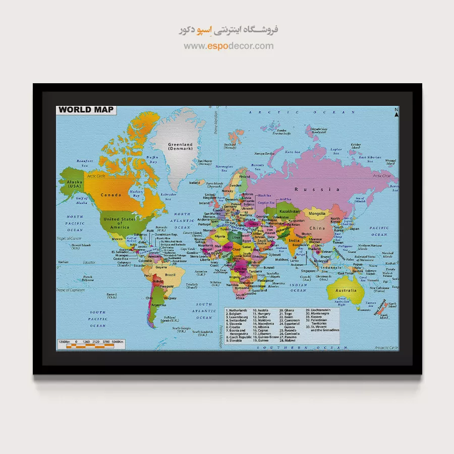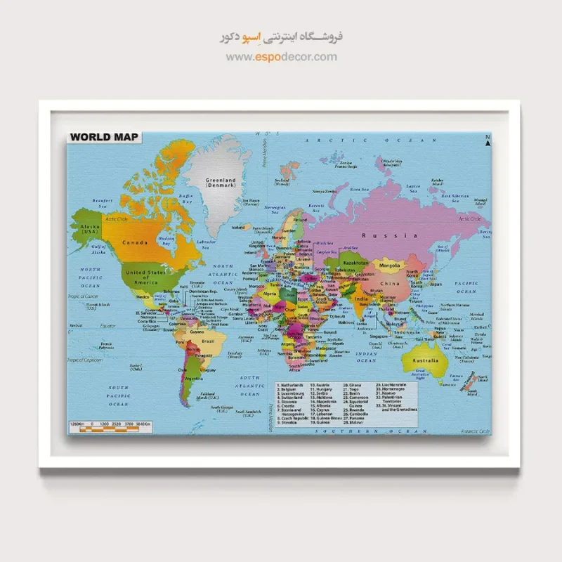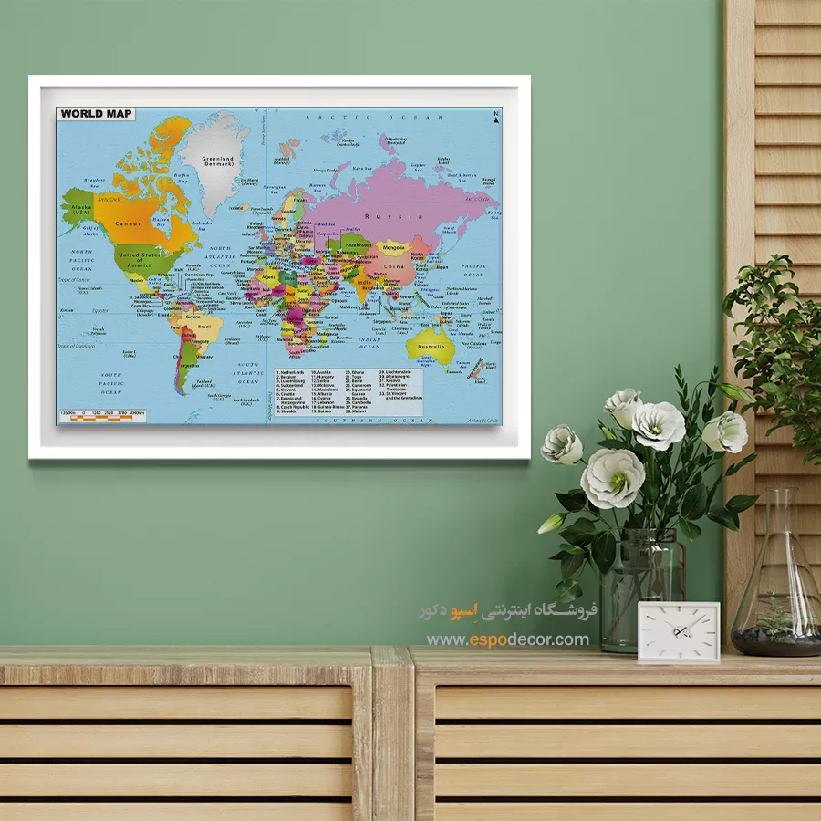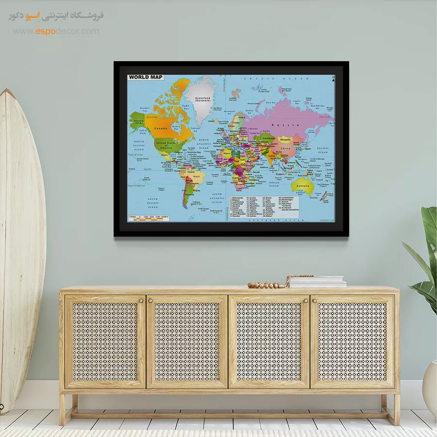 تابلو نقشه جهان مدرن «نقشه جهان برای اتاق» با قاب مشکی