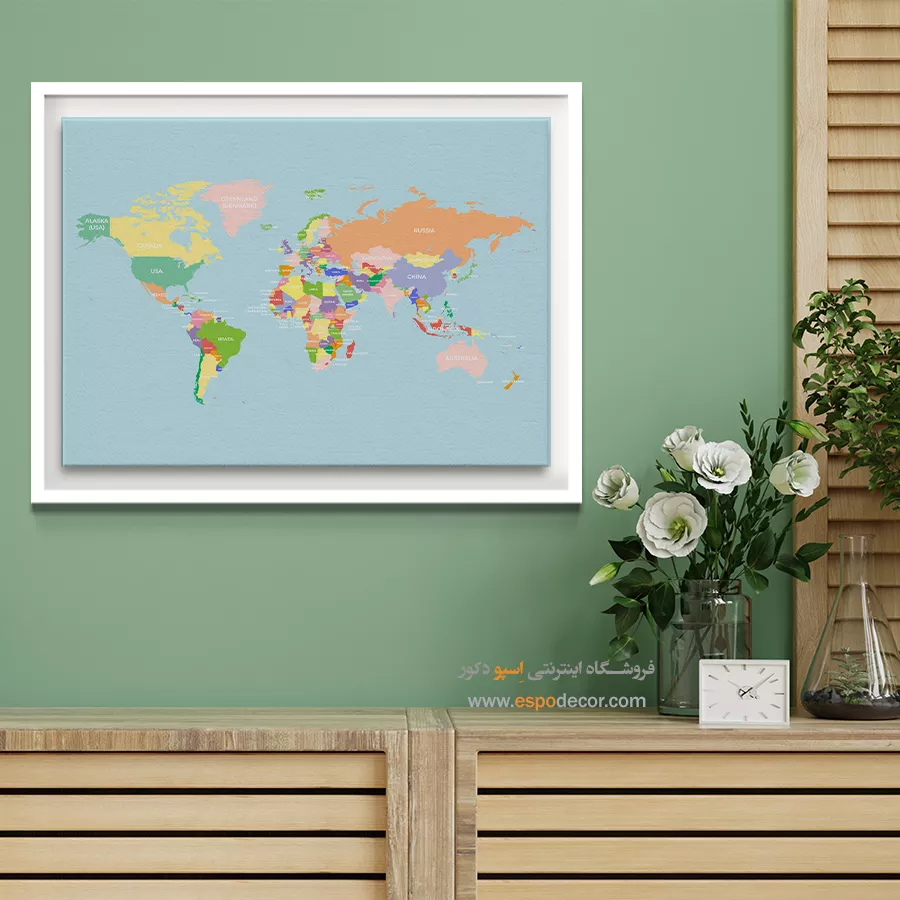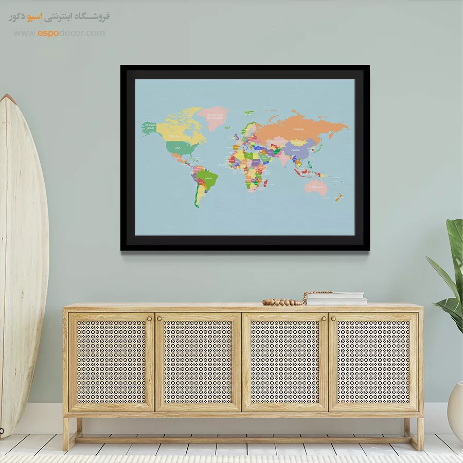 تابلو نقشه جهان مدرن «نقشه جهان برای پذیرایی» با قاب مشکی
