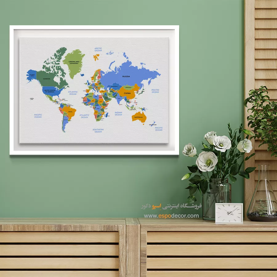 تابلو نقشه جهان با رنگهای ملایم، مناسب فضای آرام