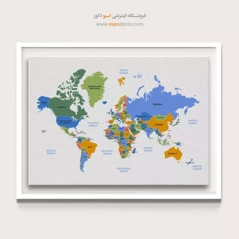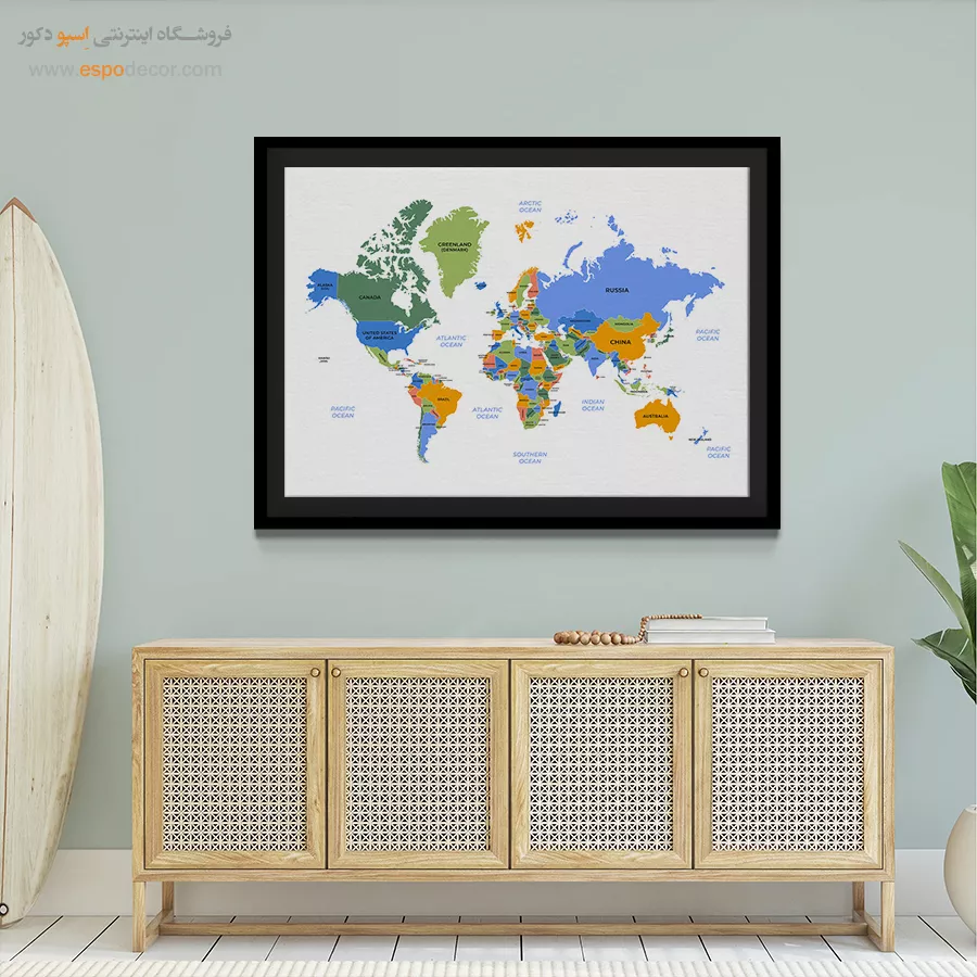 تابلو نقشه جهان مدرن «تابلو نقشه جهان بدون قاب» با قاب مشکی