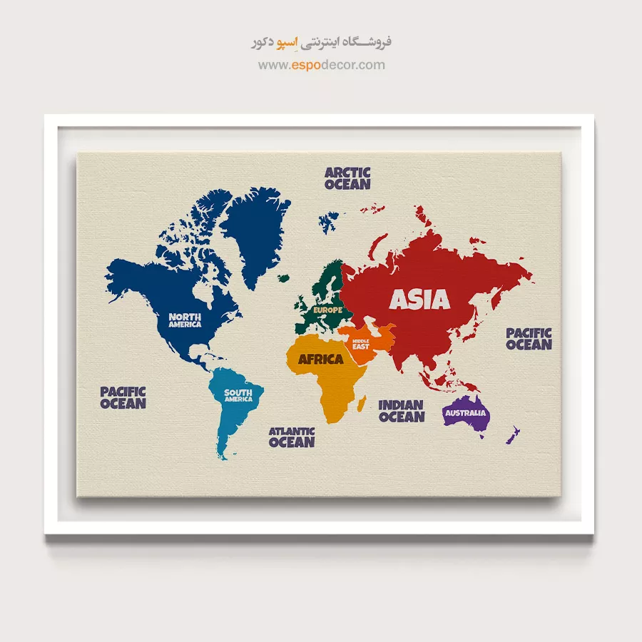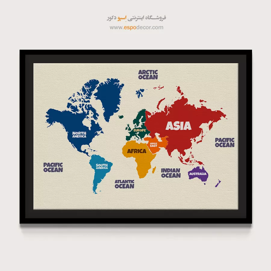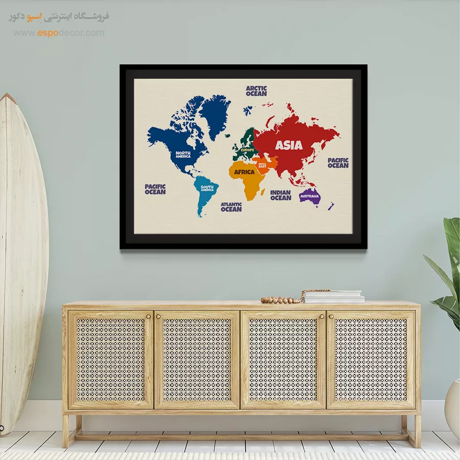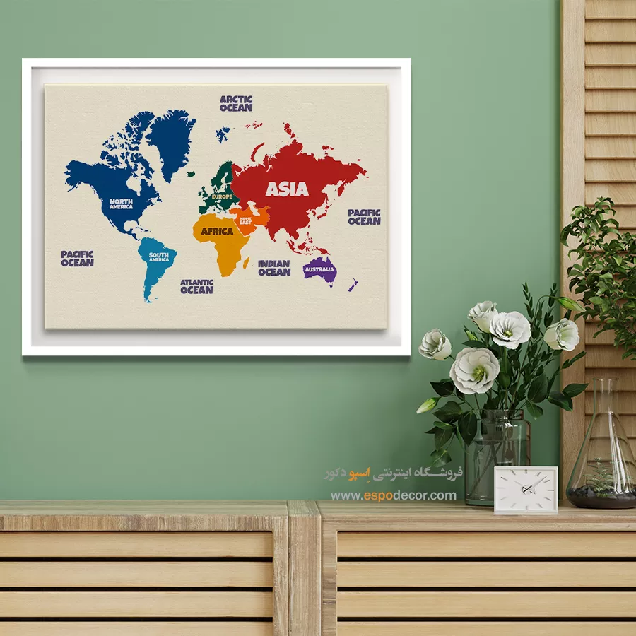 تابلو نقشه جهان با طراحی قاره ها، حس سرزندگی در دکور