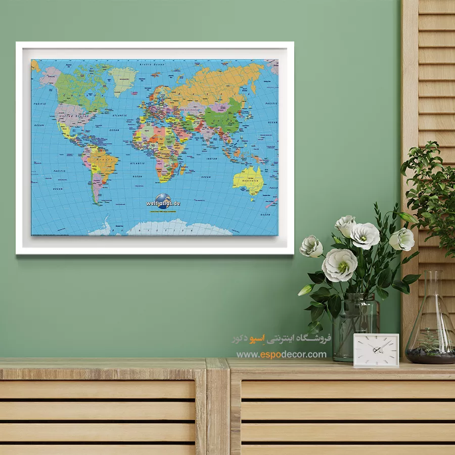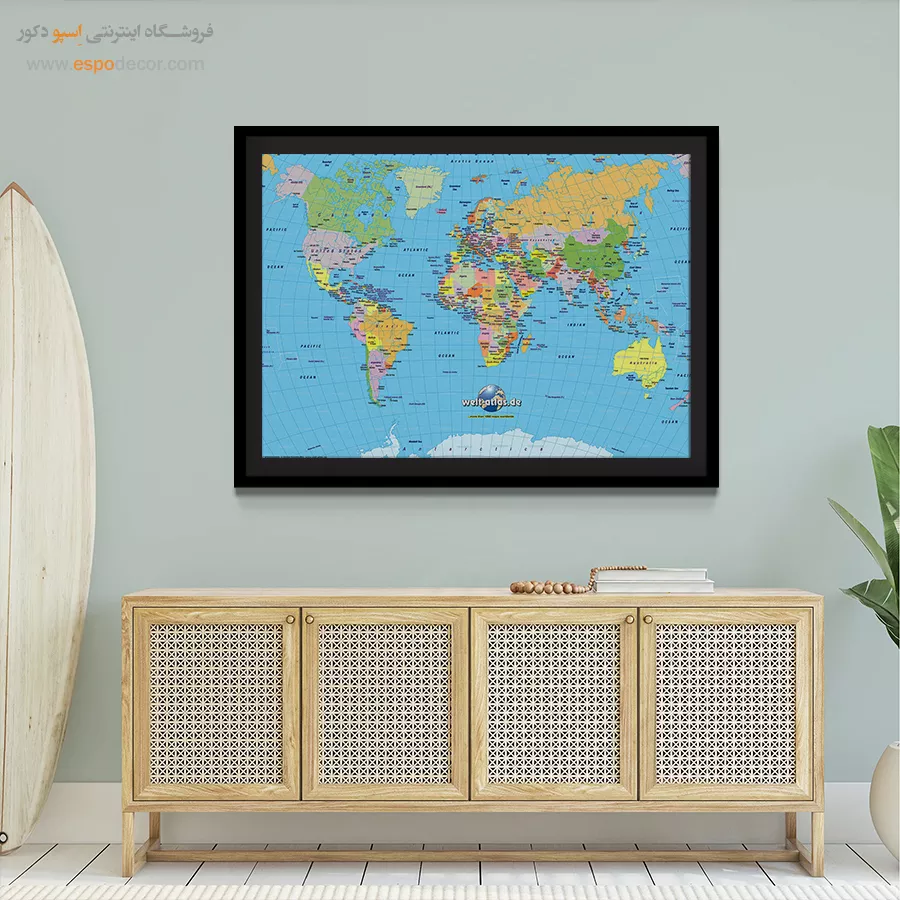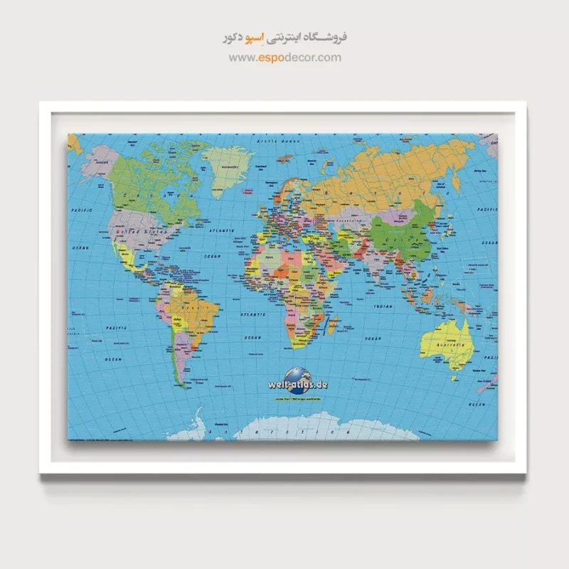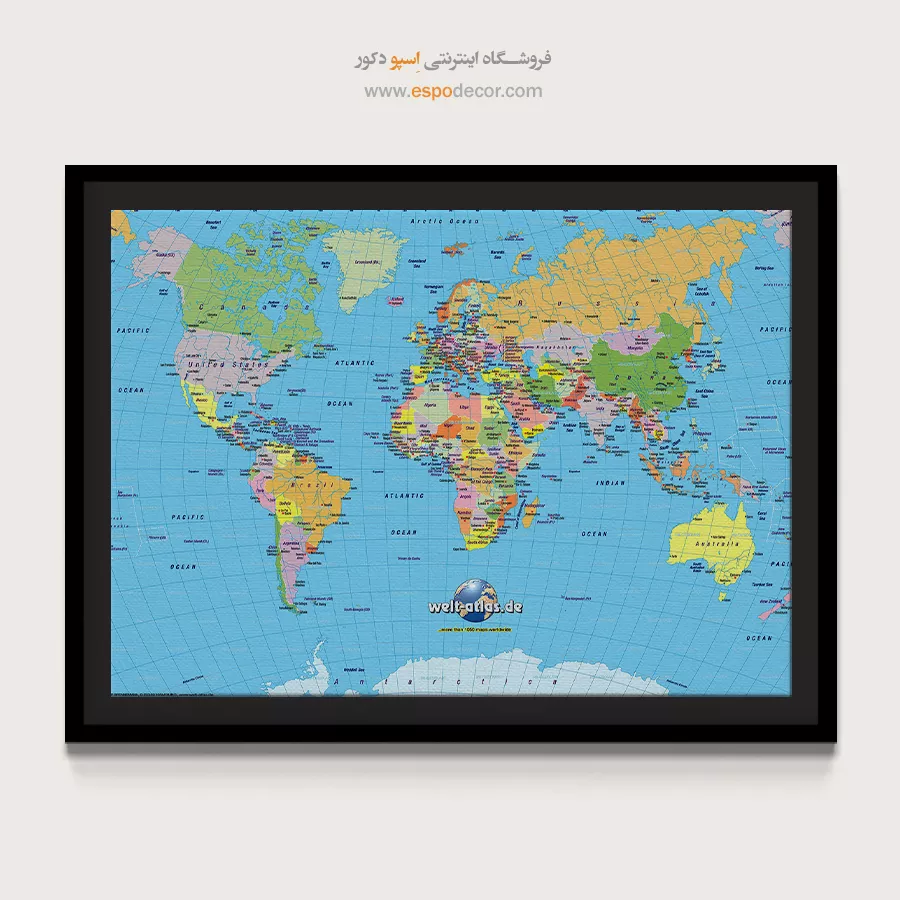 تابلو نقشه جهان مدرن «تابلو اطلس جهان» با قاب مشکی